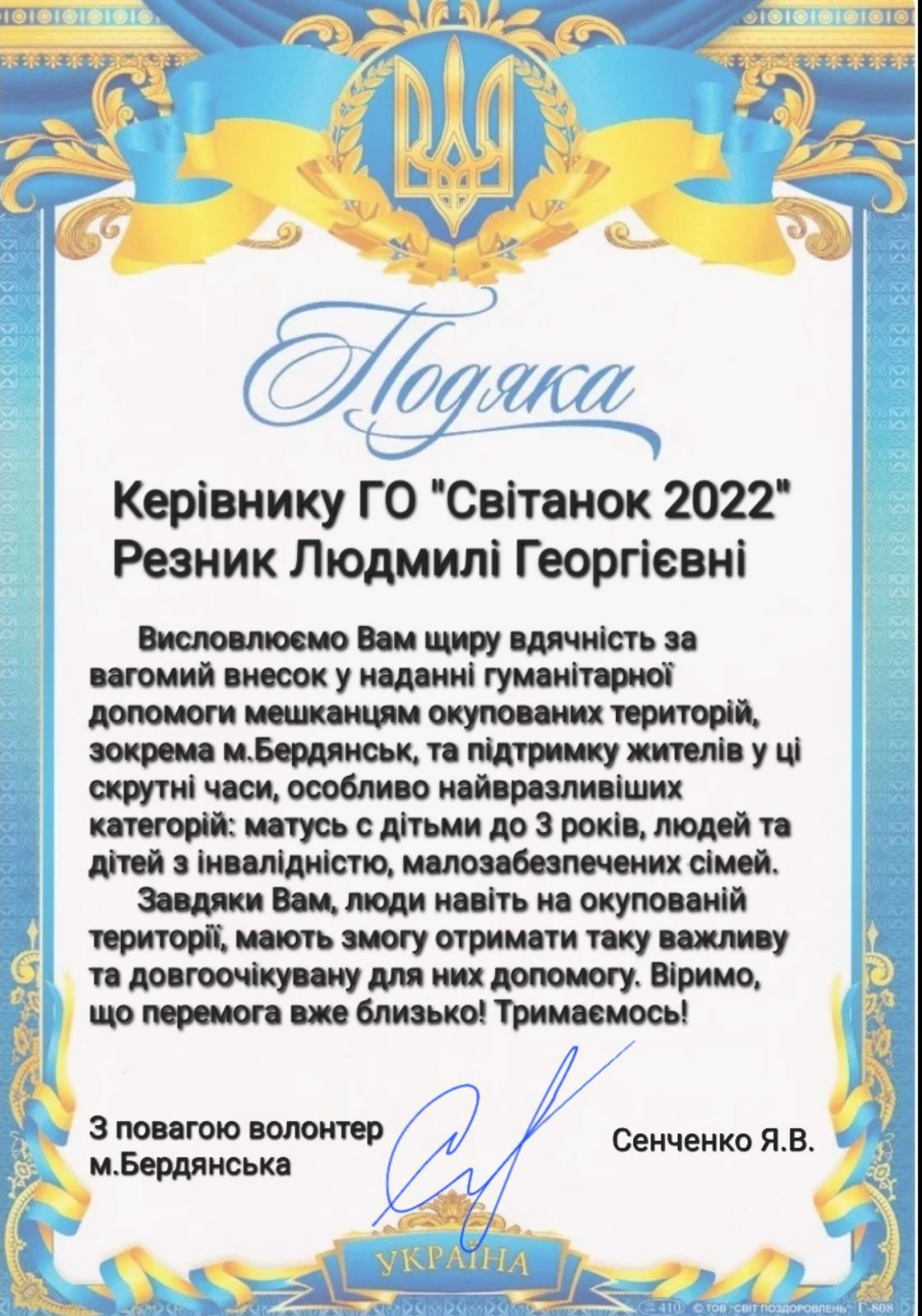 Надання допомоги найвразливішим категоріям населення, дітям та дорослим з обмеженими здібностями, малозабезпеченних сімей, людей похилого віку 80+, ВПО в м. Запоріжжя з тимчасово окупованих районів. Забезпечення гуманітарною допомогою населення тимчасово окупованих тереторій ХЕРСОНСЬКОЇ та ЗАПОРІЗЬКОЇ областей.